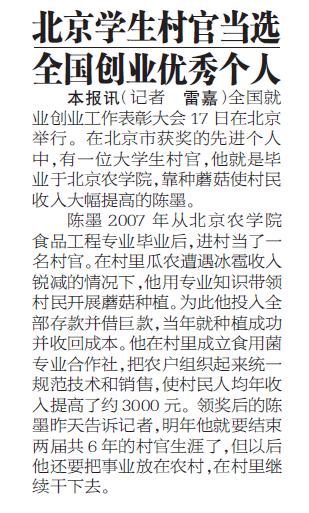 本報訊 全國就業創業工作表彰大會17日在北京舉行。在北京市獲獎的先進個人中,有一位大學生村官,他就是畢業于北京農學院,靠種蘑菇使村民收入大幅提高的陳墨。