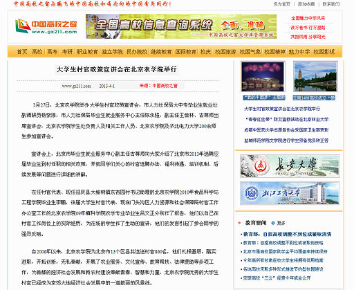 自2006年以來,北京農學院為北京市13個區縣共選送村官860名,他們扎根基層,踏實進取,開拓創新,無私奉獻,開展了農業服務、文化宣傳、教育幫扶、法律援助等多項工作,為首都的經濟社會發展和新農村建設奉獻青春、智慧和力量,北京農學院優秀的大學生村官已經成為京郊大地經濟社會發展中的一道靚麗的風景線。
