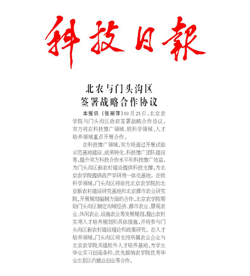 本報訊 (張麗萍)10月25日,北京農學院與門頭溝區政府簽署戰略合作協議,雙方將在科技推廣領域、軟科學領域、人才培養領域重點開展合作。