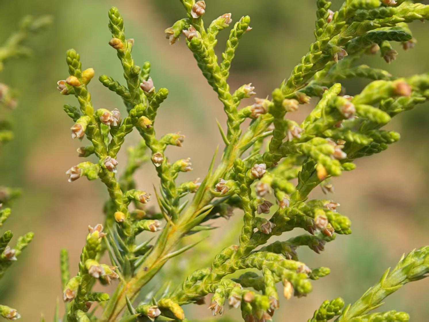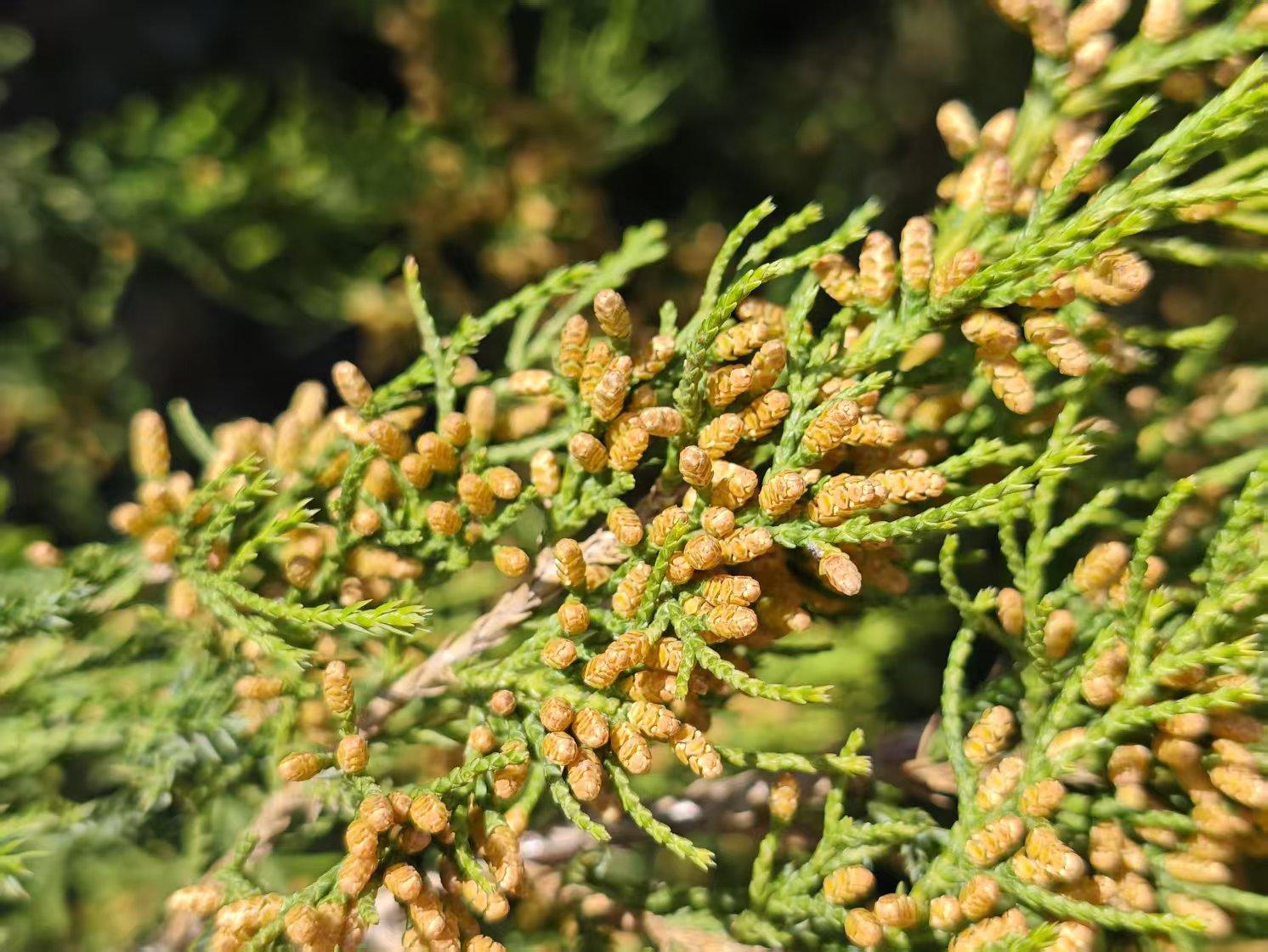 青翠的圓柏滿樹(shù)金黃,大風(fēng)一吹,雄株球花爆裂,黃色的花粉噴出,飄散如沙霧。近些天來(lái),對(duì)柏科花粉過(guò)敏的市民出現(xiàn)了眼睛癢、打噴嚏、流鼻涕的癥狀,著實(shí)度過(guò)了艱難的兩周。