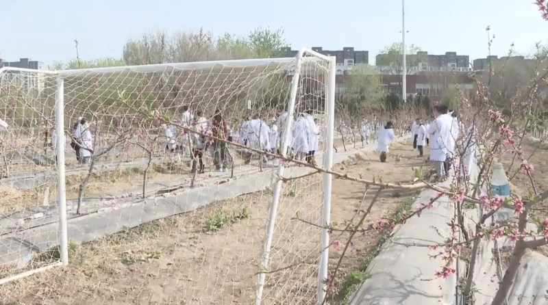 鏡頭切換到學校的戶外果園里,教育教學活動正在進行。這堂課比較特殊,在果樹間的空地上,拉起一道排球網,旁邊的林間空地上,還設置了足球的“球門”。園藝專業的同學們分成幾個小組,投身到排球和足球運動中。在林中、在花間,這場春日運動別有韻味。
