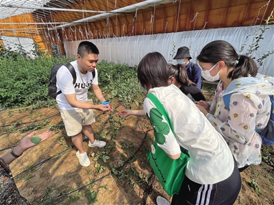 “好多蚜蟲!”“棉花葉片上的蚜蟲竟然不肯吃西瓜葉片,西瓜葉片上的蚜蟲寧愿餓死也不肯吃棉花葉片,真的嗎?這是為什么?”另一組的孩子們第一次來到北京農學院,沒有直接進入實驗室,而是被北京農學院生物與資源環(huán)境學院副教授郭洪剛帶到了教學實踐基地進行觀察,這里的自然生態(tài)讓孩子們大開眼界。