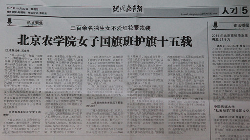 北京農學院的女子國旗班迄今已風雨無阻地走過了15年。15年來,該院以女子國旗班建設為載體對大學生開展生動形象的愛國主義教育,使之成為當代大學生弘揚愛國主義精神的先鋒集體。