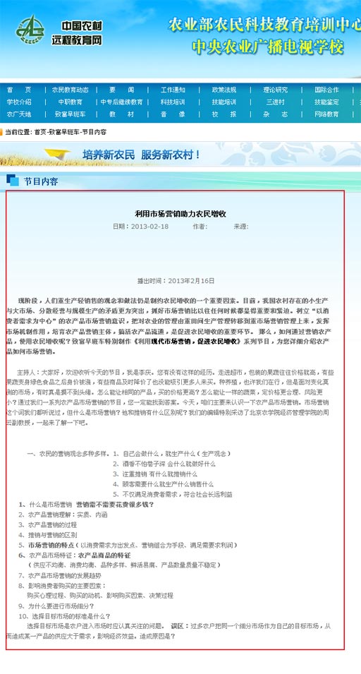 現(xiàn)階段,人們重生產(chǎn)輕銷售的觀念和做法仍是制約農(nóng)民增收的一個重要因素。目前,我國農(nóng)村存在的小生產(chǎn)與大市場、分散經(jīng)營與規(guī)模生產(chǎn)的矛盾更為突出,抓好市場營銷比以往任何時候都顯得重要和緊迫。樹立“以消費者需求為中心”的農(nóng)產(chǎn)品市場營銷意識,把對農(nóng)業(yè)的管理由重田間生產(chǎn)管理轉移到重市場營銷管理上來,發(fā)揮市場機制作用,培育農(nóng)產(chǎn)品營銷主體,搞活農(nóng)產(chǎn)品流通,是促進農(nóng)民增收的重要環(huán)節(jié)。那么,如何通過營銷農(nóng)產(chǎn)品,使用農(nóng)民增收呢?致富早班車特別制作《利用現(xiàn)代市場營銷,促進農(nóng)民增收》系列節(jié)目,為您詳細介紹農(nóng)產(chǎn)品如何市場營銷。 主持人:大家好,歡迎收聽今天的節(jié)目,我是李慶。您有沒有這樣的經(jīng)歷。走進超市,包裝的果蔬往往價格就高,有些果蔬變身綠色食品之后身價被漲,有些商品及時降價了也沒能吸引更多人來買。種養(yǎng)殖,也許我們在行,但是面對變化莫測的市場,有時真是摸不到頭緒。怎么能讓相同的產(chǎn)品,買的價格更高?怎么能讓一樣的蔬菜,定價格更合理、風險更小?通過我們一系列農(nóng)產(chǎn)品市場營銷的節(jié)目,您一定能找到答案。今天,咱們主要來認識一下農(nóng)產(chǎn)品市場營銷。市場營銷這個詞我們都聽說過,但什么是市場營銷?他和推銷有什么區(qū)別呢?我們的編輯特別采訪了北京農(nóng)學院經(jīng)濟管理學院的周云副教授,一起來了解一下吧。
