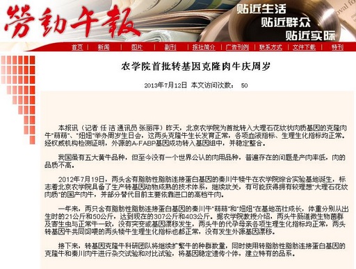 2012年7月19日,兩頭含有脂肪性脂肪連接蛋白基因的秦川牛犢牛在農學院綜合實驗基地誕生,標志著北京農學院具備了生產轉基因動物成熟的技術體系,繼續攻關,有可能獲得擁有較理想“大理石花紋肉質”的國產肉牛,并部分替代目前主要依靠進口的高檔牛肉。