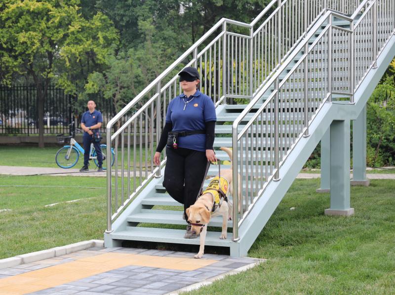 遇到前方有障礙物,導盲犬自覺放慢了速度,用身體的搖擺來提醒主人往哪個方向躲避;聽到“過通道”“找旗桿”的指令,它們能帶領主人順利找到位置……5月19日是第34個全國助殘日,北京農學院、北京市殘聯在北京市導盲犬培訓基地開展導盲犬體驗活動,展示導盲犬工作場景、科普導盲犬相關知識,讓更多人體驗視障人士使用導盲犬的實際感受,從而在生活中為導盲犬提供工作便利,更好地助力視障人士無障礙出行。