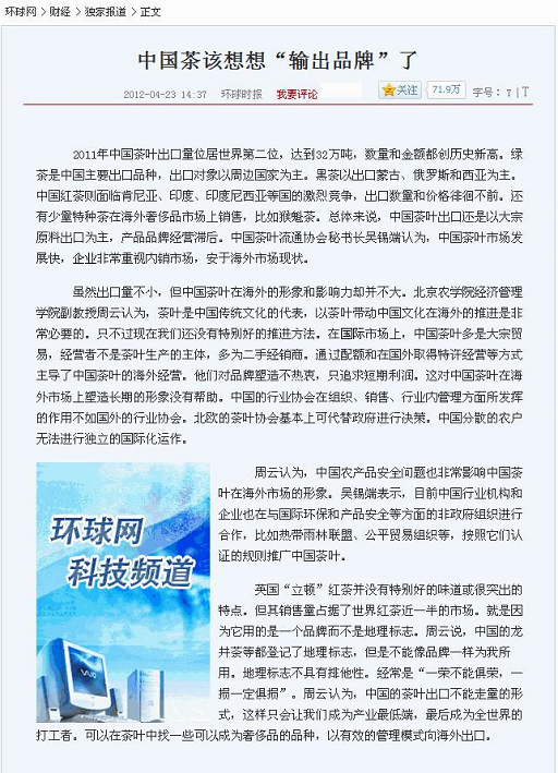 英國“立頓”紅茶并沒有特別好的味道或很突出的特點。但其銷售量占據(jù)了世界紅茶近一半的市場。就是因為它用的是一個品牌而不是地理標志。周云說,中國的龍井茶等都登記了地理標志,但是不能像品牌一樣為我所用。地理標志不具有排他性。經(jīng)常是“一榮不能俱榮,一損一定俱損”。周云認為,中國的茶葉出口不能走量的形式,這樣只會讓我們成為產(chǎn)業(yè)最低端,最后成為全世界的打工者。可以在茶葉中找一些可以成為奢侈品的品種,以有效的管理模式向海外出口。
