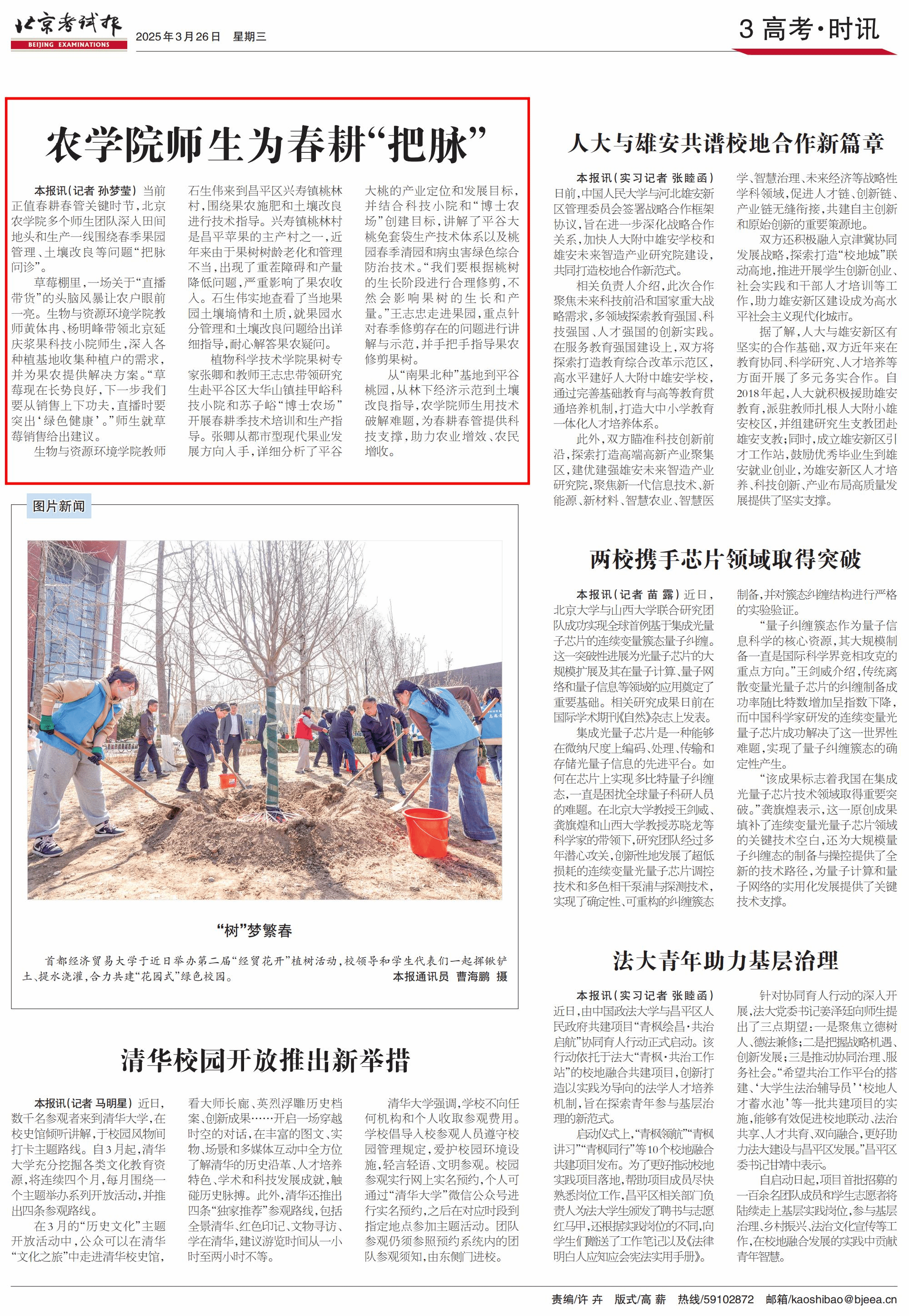 從“南果北種”基地到平谷桃園,從林下經濟示范到土壤改良指導,農學院師生用技術破解難題,為春耕春管提供科技支撐,助力農業增效、農民增收。