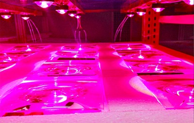 穿上實驗防護裝,戴上手套,“全副武裝”的記者鉆進了一個粉紫色的“夢幻世界”。只見數(shù)千束光從LED燈里發(fā)出,直射底端的白色“貨架”,光的粉紫色將500多平方米的“工廠車間”照射得晶瑩透亮。