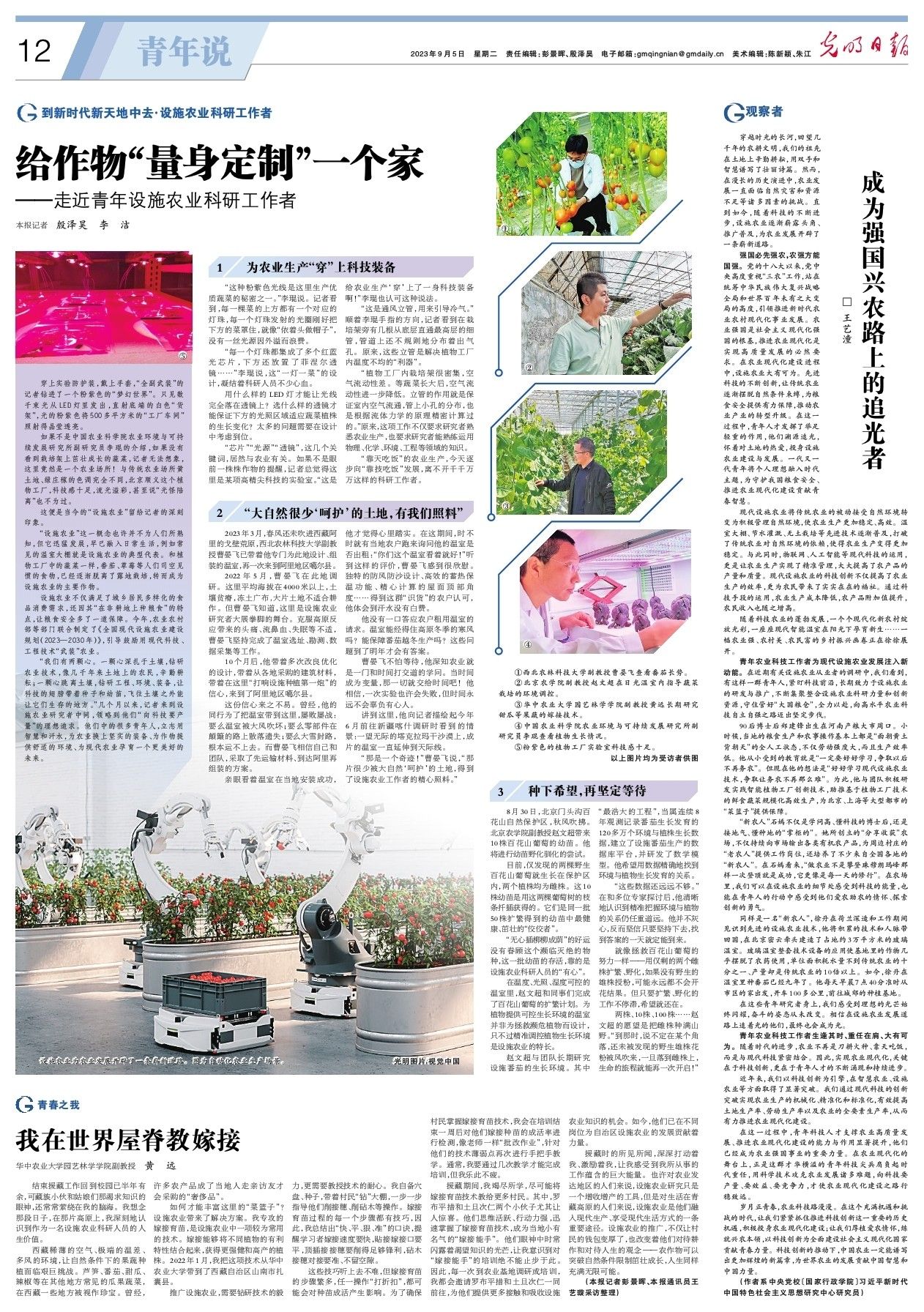 “我們有兩顆心。一顆心深扎于土壤,鉆研農(nóng)業(yè)技術(shù),像幾千年來土地上的農(nóng)民,辛勤耕耘;一顆心跳離土壤,鉆研工程、環(huán)境、裝備,讓科技的翅膀帶著種子和幼苗,飛往土壤之外能讓它們生存的地方。”幾個月以來,記者來到設(shè)施農(nóng)業(yè)研究者中間,領(lǐng)略到他們“向科技要產(chǎn)量”的理想追求。他們中的很多青年人,立志用智慧和汗水,為農(nóng)業(yè)換上堅實的裝備、為作物提供舒適的環(huán)境、為現(xiàn)代農(nóng)業(yè)孕育一個更美好的未來。