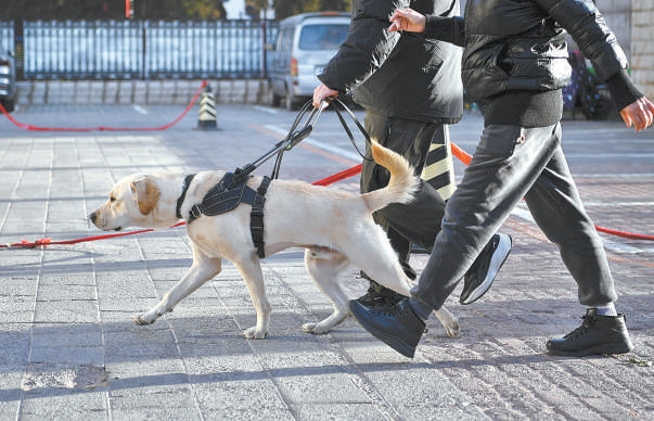 “好!保持,慢一點……”8時30分,農學院北門外,一位視障學員在導盲犬引導下緩慢前行。一位訓導員跟隨其后,隨時發布口令。