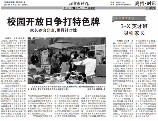 上周末,北京大學、清華大學、北京師范大學、北京工業大學、首都師范大學等校的10余場校園開放日活動同時舉行。與北建工首場大規模咨詢相比,前往咨詢的家長明顯分流,但更有針對性。
