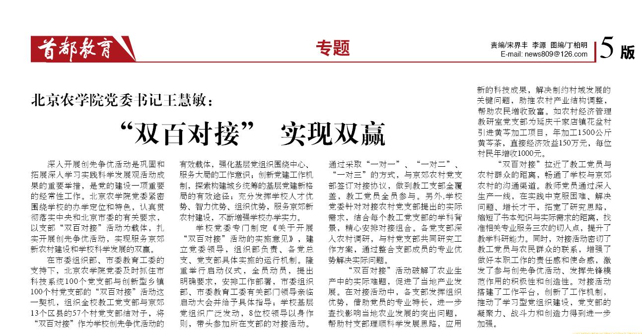 【農(nóng)學(xué)院】【首都教育】北京農(nóng)學(xué)院黨委書記王慧敏:“雙百對(duì)接”實(shí)現(xiàn)雙贏