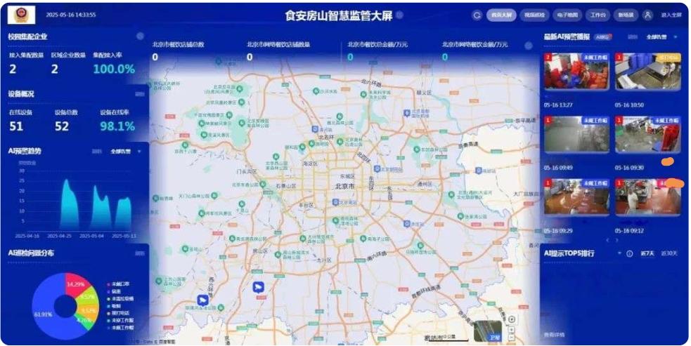 近日,房山區校園餐飲集配企業正式上線AI智能餐飲監管系統。該系統通過部署AI視覺識別攝像頭、物聯網傳感器及冷鏈物流溫濕度實時預警裝置,覆蓋后廚操作間、餐具消毒室、肉制品冷庫等全場景,動態監控食材貯存條件、操作規范、消毒時效等關鍵環節,并自動識別工作人員未穿戴工作服或口罩、食材過期、異物污染等30余類風險,實時推送預警至企業和監管部門,實現食品安全監管從傳統模式向AI智能化的跨越式升級。