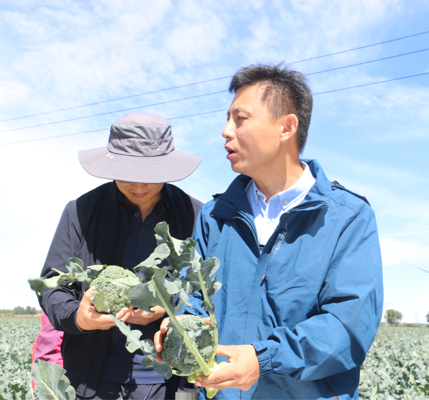 李占省(右一)在地里考察西蘭花長(zhǎng)勢(shì)