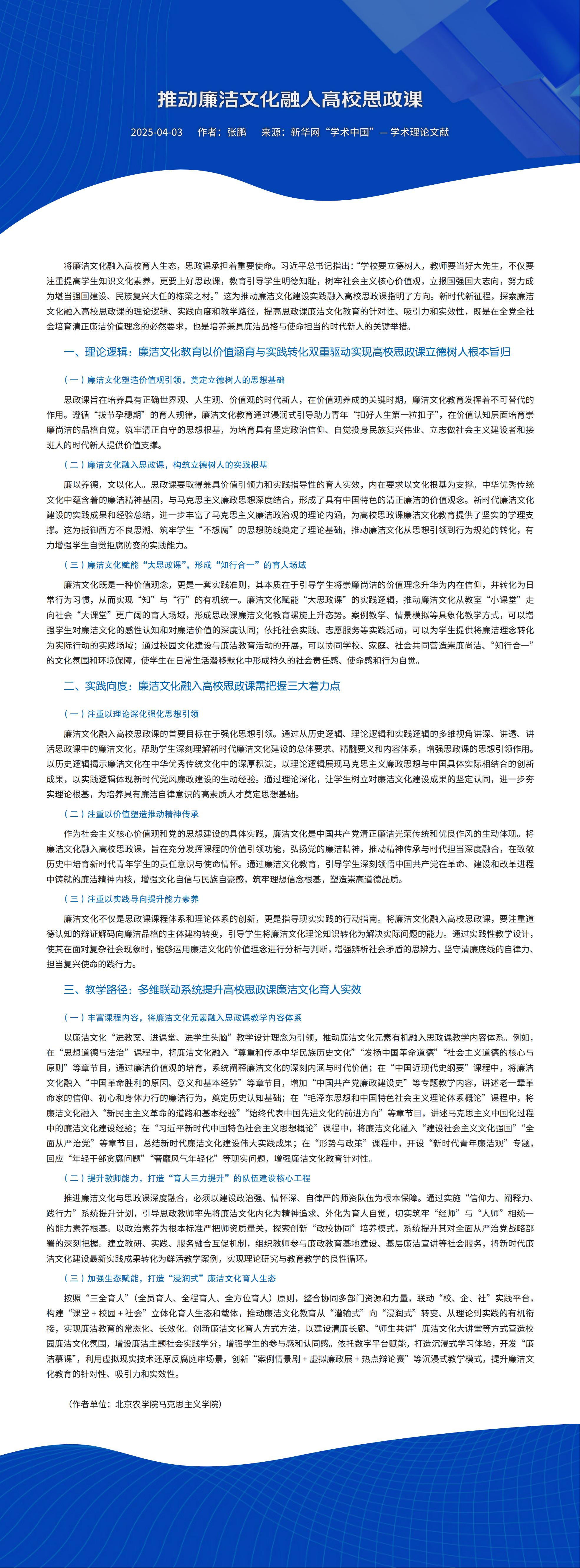 摘要:將廉潔文化融入高校育人生態,思政課承擔著重要使命。本文從三個方面對推動廉潔文化融入高校思政課進行了詳細論述,以期在全黨全社會培育清正廉潔價值理念,培養兼具廉潔品格與使命擔當的時代新人。
