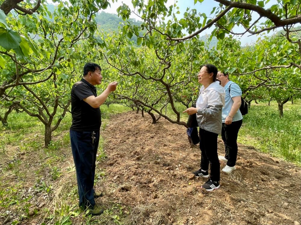 北寨村村民于紀(jì)紅(左一)在杏林里與北京農(nóng)學(xué)院專家交流(5月16日攝)。新華社記者 趙旭 攝