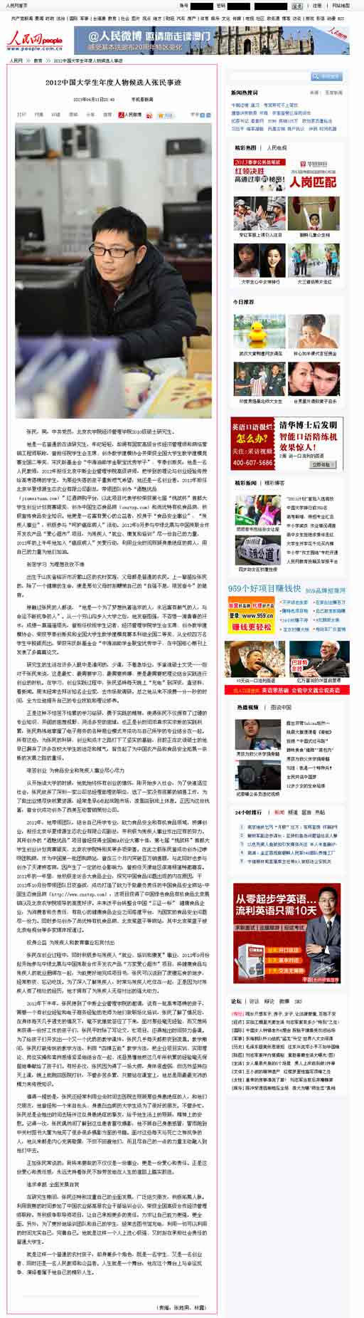 2012年,他帶領團隊,結合自己所學專業,致力食品安全和有機食品領域,拼搏創業,擔任北京華夏綠源生態農業有限公司副總,并積極為殘疾人事業作出應有的努力。其所創辦的“酒魅優品”項目曾經獲得全國MBA創業大賽十佳,第七屆“挑戰杯”首都大學生創業計劃競賽銀獎、北京農學院特別獎等多項榮譽。在此之前張民曾成功創辦過咿呀團購網,作為中國第一批團購網站,曾在三個月內突破百萬銷售額,與此同時也參與創辦了天津拼客網,因產生了一定的社會影響力,曾擔任天津地區濱海頻道特邀嘉賓。2012年的一年里,他積極走訪各大食品企業,探究中國食品問題出現的內在原因,于2012年10月份帶領團隊日夜奮戰,成功打造了致力于做最負責任的中國食品安全網站-中國生態食品網,該項目獲得了中國綠色食品有機食品北京展銷以及北京農學院領導的高度好評。未來該平臺將整合中國“三證一標” 健康食品企業,為消費者和負責任、有良心的健康食品企業之間搭建平臺,為國家的食品安全問題盡一份力。同時參與創辦了尚優特有機食品網、北京菜籃子等網站,其中北京菜籃子被北京電視臺等多家媒體報道過。