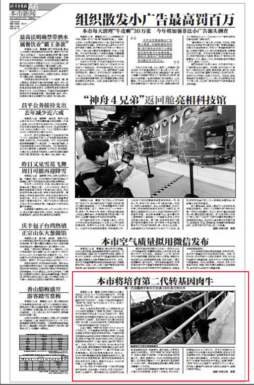 記者了解到,“萌萌”和“妞妞”出生于2012年7月和8月。作為國家轉基因重大專項——優質高效轉基因肉牛新品種培育的團隊,中國農科院北京畜牧獸醫所和北京農學院的科學家們的目標是:培育出中國產的、肌肉中均勻分布大理石紋理樣脂肪的高級肉牛,讓國人能吃上國產的“雪花牛肉”。為此,團隊花了3年時間,在400多頭牛身上做過實驗,最終將脂肪性脂肪酸結合蛋白基因(A-FABP)轉入中國名?!卮ㄅ5奶撼衫w維細胞內,再用體細胞克隆技術,把含A-FABP成纖維細胞注射到成熟的去核卵子內,使其體外發育成重構胚胎,最后把胚胎移植進同期發育的母牛子宮內,最終產出含A-FABP的牛犢——即“萌萌”和“妞妞”。
