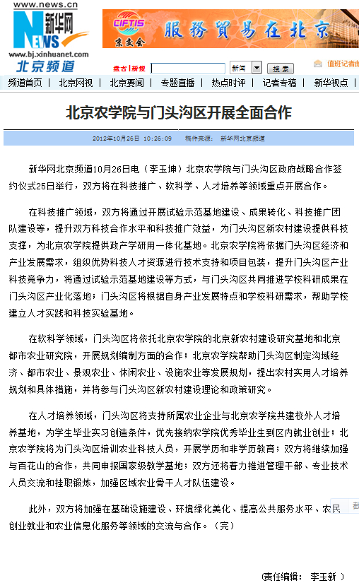 新華網北京頻道10月26日電(李玉坤)北京農學院與門頭溝區政府戰略合作簽約儀式25日舉行,雙方將在科技推廣、軟科學、人才培養等領域重點開展合作。