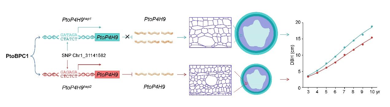 日前,北京農學院、北京林業大學張德強教授團隊在國際頂尖期刊《植物細胞》雜志在線發表了題為“楊樹脯氨酸4-羥化酶基因變異調控樹干動態生長的分子機制”的研究論文。該研究通過引入時間維度作為表型挖掘了調控毛白楊胸徑多年生動態生長的重要功能基因PtoP4H9(脯氨酸4-羥化酶),揭示了該基因通過調控細胞壁的化學修飾來促進樹干縱向生長的分子生物學機制。該研究結果不僅填補了國內外樹木多年生動態生長的遺傳調控機制一直不清楚的技術空白,還將會為木材產量與品質遺傳改良、精準育種等卡脖子問題提供關鍵理論指導與技術支撐,具有重要的科學價值和社會價值。