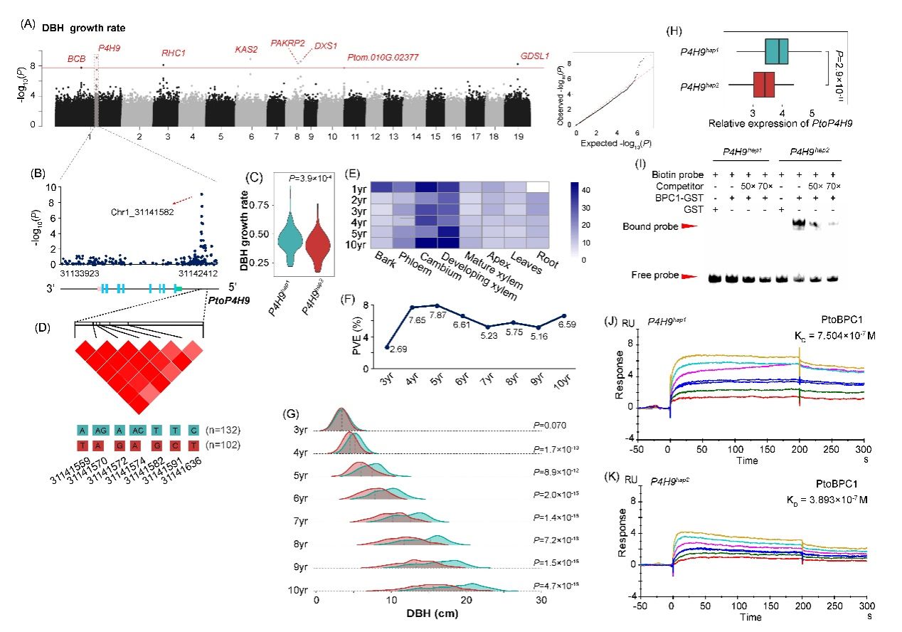 團隊研究人員以毛白楊種質資源群體中303株個體為材料,連續8年對其主干進行表型測定,并通過擬合生長軌跡模型精準捕獲多年生生長速率等典型特征。隨后利用全基因組關聯分析策略和時空表達數據,定位到一個控制毛白楊胸徑性狀的關鍵基因PtoP4H9。綜合序列分析發現,該基因序列變異形成的單體型PtoP4H9hap2啟動子區域存在GA-rich motif,其為轉錄因子PtoBPC1的結合位點;而PtoP4H9hap1啟動子區域則缺少這一序列特征。通過對毛白楊種質資源群體不同個體的組織特異性定量表達分析表明,PtoP4H9hap1在形成層組織中比PtoP4H9hap2有更高的表達量。電泳遷移率檢測和表面等離子共振等分子互作實驗證實了轉錄因子PtoBPC1與PtoP4H9hap2的結合能力顯著高于PtoP4H9hap1(圖1),表明PtoP4H9啟動子的自然變異影響了其上游轉錄因子的結合效率,進而改變了PtoP4H9的表達水平。