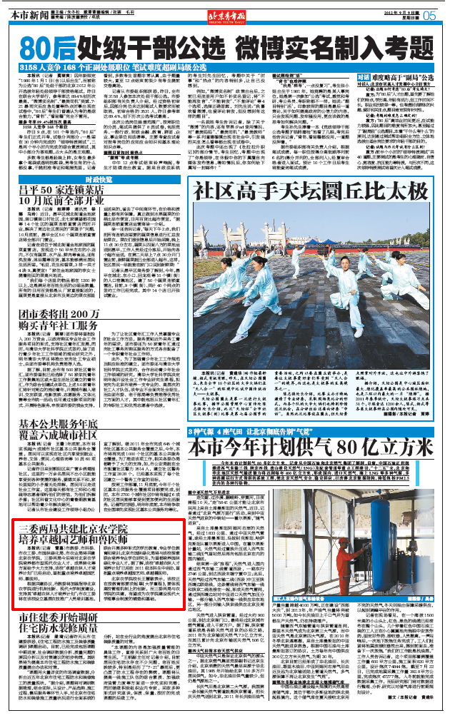 本報(bào)訊(記者 雷嘉)市教委、市科委、市農(nóng)工委、市園林綠化局、市農(nóng)業(yè)局將共建北京農(nóng)學(xué)院,三委兩局今后將對(duì)北京農(nóng)學(xué)院培養(yǎng)都市型現(xiàn)代農(nóng)業(yè)人才、成果轉(zhuǎn)化等方面給予大力支持。該校“卓越農(nóng)林人才培養(yǎng)計(jì)劃”已經(jīng)啟動(dòng),首批重點(diǎn)培養(yǎng)卓越園藝師、獸醫(yī)師。