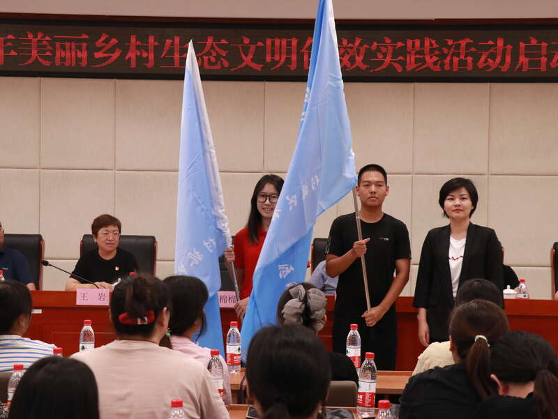 在“走進京郊大地 建功美麗鄉村”北京青年美麗鄉村生態文明創效實踐活動啟動儀式上,團北京市委副書記鐘棉棉為“青振京郊”鄉村振興青年志愿服務隊授旗。受訪者供圖。