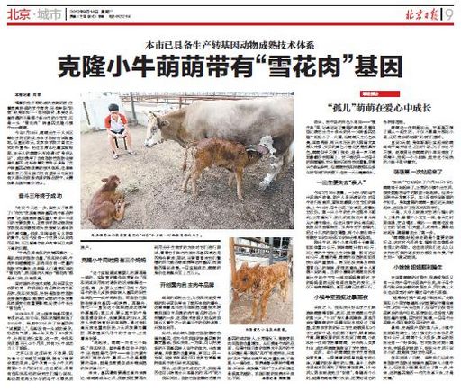 今年7月19日,萌萌出生于大興區(qū)磁各莊附近的北京農(nóng)學(xué)院綜合試驗(yàn)基地。但直到昨天,北京農(nóng)學(xué)院才首次正式對(duì)外宣布:經(jīng)過(guò)血液和毛囊實(shí)驗(yàn)檢測(cè),26天大的萌萌已初步通過(guò)“身份認(rèn)證”,成功攜帶了含有脂肪性脂肪連接蛋白基因。這標(biāo)志著北京終于具備了生產(chǎn)轉(zhuǎn)基因動(dòng)物成熟的技術(shù)體系。也意味著北京乃至全國(guó)百姓有望早日吃到擁有大理石花紋般肉質(zhì)的精品肥牛,無(wú)需依靠從國(guó)外高價(jià)進(jìn)口。