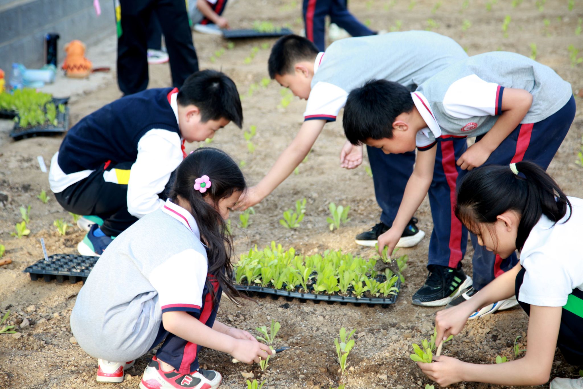 小學生們在栽種菜苗
