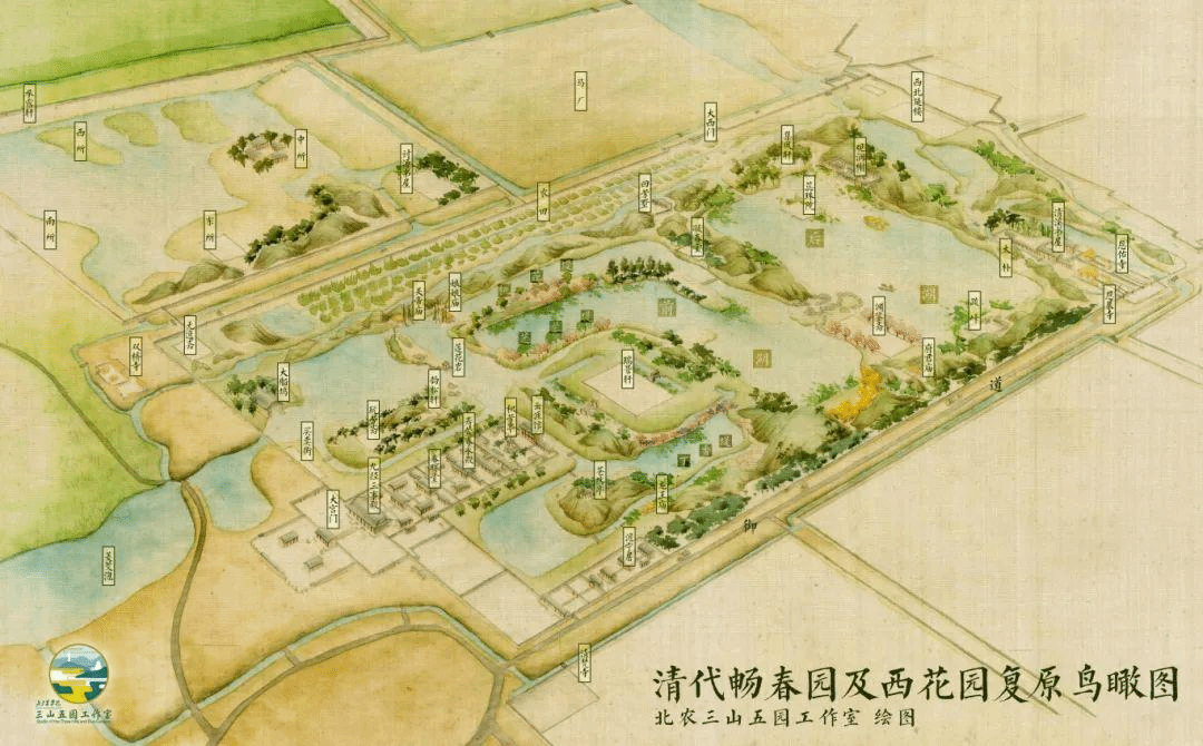 清代暢春園及西花園復原鳥瞰圖(朱強團隊繪)