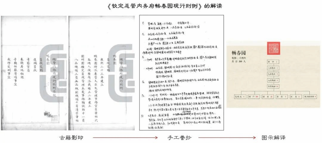 《欽定總管內(nèi)務府暢春園現(xiàn)行則例》的影印本文字非常小,團隊就一筆一筆地抄錄下來,再進行圖示轉(zhuǎn)譯,梳理出負責暢春園管理維護人員情況;古人繪制的“樣式雷”圖檔用蘇州碼子標注建筑群尺寸,就需要團隊將蘇州碼子翻譯為阿拉伯數(shù)字再進行計算……