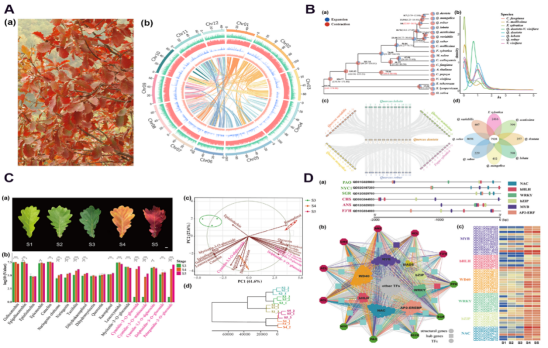 A槲樹基因組特征;B系統發育、基因家族和共線性分析;C葉色轉變過程中類黃酮含量的變化;D葉色轉變過程中相關轉錄因子表達量分析 課題組供圖
