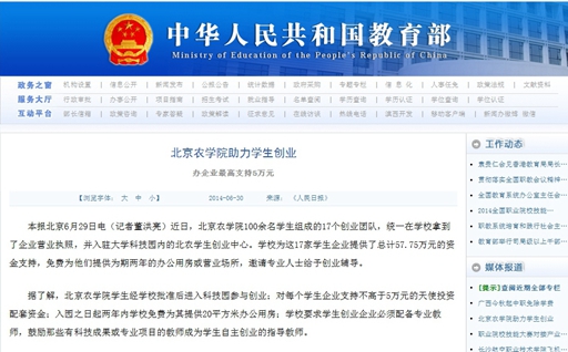 月30日,教育部官方網站轉載人民日報報道《北京農學院助力學生創業》,并在教育部官方網站首頁“媒體聚焦”欄目推介。