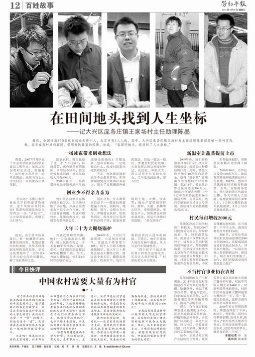 最近,全國評出240名就業創業先進個人,北京市有7人入選。其中,大興區龐各莊鎮王場村村主任助理陳墨則是唯一的村官代表。回首在農村站穩腳跟、帶領村民致富的經歷,他說:“在田間地頭,我找到了人生坐標。”