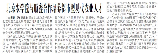本報訊 (張麗萍)6月8日,北京農學院與北京順鑫農業發展集團公司共建人才培養基地簽約儀式舉行。未來5年,雙方將緊密合作,在都市型現代農業人才培養和服務首都社會經濟等方面開展全面戰略合作。