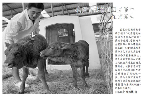 國(guó)家轉(zhuǎn)基因重大專(zhuān)項(xiàng)子項(xiàng)目“優(yōu)質(zhì)高效轉(zhuǎn)基因肉牛新品種培育”獲重要進(jìn)展,首批兩頭含有脂肪性脂肪連接蛋白基因(FABP)的秦川牛犢牛不久前在北京農(nóng)學(xué)院綜合實(shí)驗(yàn)基地誕生。這是我國(guó)首批轉(zhuǎn)入大理石花紋狀肉質(zhì)基因的克隆肉牛。該技術(shù)為培育我國(guó)自主品牌的肉牛新品種邁出了關(guān)鍵性一步。圖為活潑可愛(ài)的首批兩頭含有脂肪性脂肪連接蛋白基因(FABP)的秦川牛犢牛。