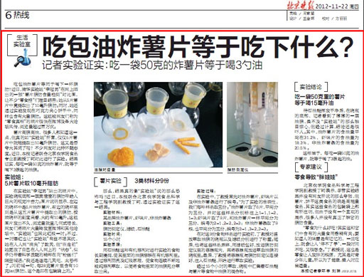 記者實驗證實:吃一袋50克的炸薯片等于喝3勺油