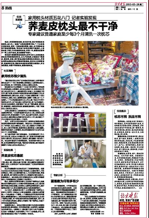 對于實驗結果,中華環(huán)保聯(lián)合會環(huán)保標準專業(yè)委員會理事、北京服裝學院材料學院副教授龔龑博士表示,居民提供的枕芯樣品得出了不同的結論,這個實驗結果是可信的。但他同時也認為,菌落總數(shù)的多少與枕頭使用者的沾污程度有關。也就是說,每個居民使用時的習慣、方式不同,導致了枕頭的衛(wèi)生狀況也不一樣。比如,幼兒園小朋友的那個蕎麥枕頭,經(jīng)過實驗證明是最臟的,可能是他在使用中沾上了的口水、奶水飲料等物。