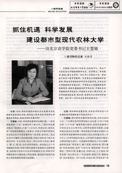 王慧敏:當前,我校面臨著重要的發展機遇。一是黨和國家的“三農”政策指明了新方向,二是科學發展觀提出了新理念,三是“人文北京、科技北京、綠色北京”對首都發展提出了新要求,四是北京都市型現代農業的定位為我校發展帶來了新思路、新目標。同時,經過五十多年的不懈努力和持續發展,學校已經形成了較為合理的學科、專業布局,成為一所以農科為特色,兼有工、管、文、理、經、法的多科性高校。特別經過近五年的跨越式發展,學校不斷完善都市型高等農業教育體系,加快都市型現代農業學科群建設步伐逐步,科研水平和服務新農村建設能力明顯增強,建設都市型現代農林大學的思路和舉措日益清晰。
