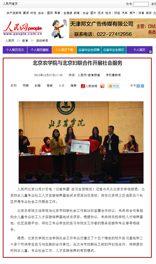 據(jù)悉,北京農(nóng)學(xué)院文法學(xué)院社會工作專業(yè)已建立了十五個穩(wěn)定的校外實(shí)習(xí)基地和二十多個可供學(xué)生實(shí)習(xí)與實(shí)踐的合作單位。此次與市婦聯(lián)社工部的開創(chuàng)性合作,將探索農(nóng)村婦女兒童、專業(yè)社會工作、人才實(shí)踐培養(yǎng)的有效模式。