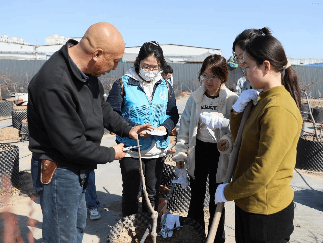 春風(fēng)吐綠萬物新,植此青綠正當(dāng)時(shí)。植物科學(xué)技術(shù)學(xué)院王志忠老師在現(xiàn)場(chǎng)開設(shè)“果樹栽種微課堂”,“選苗得挑根系發(fā)達(dá)、枝干健壯、無檢疫病蟲害的,挖坑要夠深夠?qū)挘寴涿缡嬲乖钔習(xí)r分層踏實(shí),還要澆透水。按這幾步來,小樹才能茁壯成長(zhǎng)!”他現(xiàn)場(chǎng)演示起果樹苗木定植的技術(shù)要領(lǐng)。同學(xué)們認(rèn)真傾聽、觀察,不時(shí)記下要點(diǎn)。