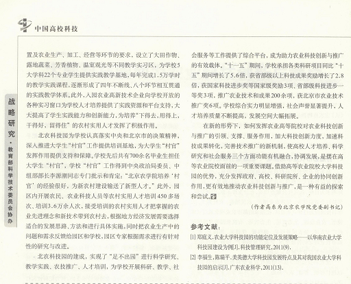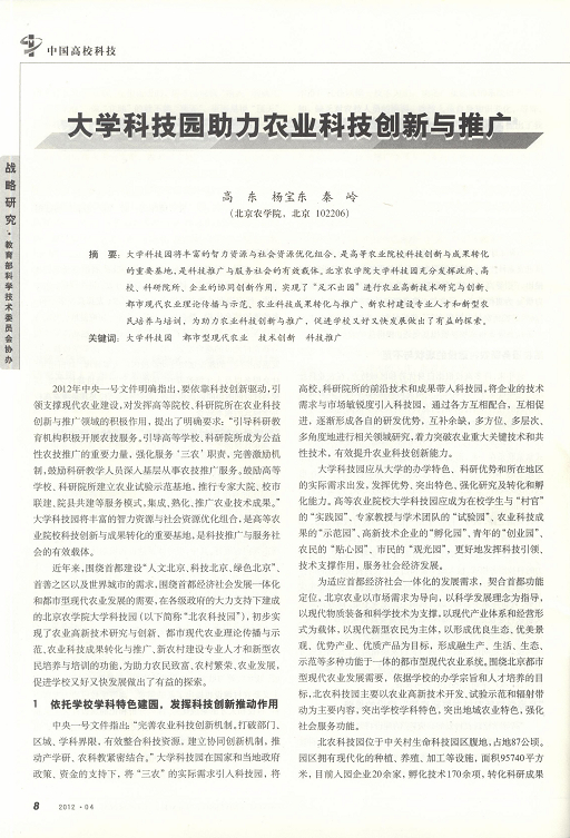 2012年中央一號文件明確指出,要依靠科技創新驅動,引領支撐現代農業建設,對發揮高等院校、科研院所在農業科技創新與推廣領域的積極作用,提出了明確要求:“引導科研教育機構積極開展農技服務。引導高等學校、科研院所成為公益性農技推廣的重要力量,強化服務‘三農’職責,完善激勵機制,鼓勵科研教學人員深入基層從事農技推廣服務。鼓勵高等學校、科研院所建立農業試驗示范基地,推行專家大院、校市聯建、院縣共建等服務模式,集成、熟化、推廣農業技術成果。” 大學科技園將豐富的智力資源與社會資源優化組合,是高等農業院校科技創新與成果轉化的重要基地,是科技推廣與服務社會的有效載體。