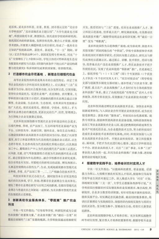 近年來,圍繞首都建設“人文北京、科技北京、綠色北京”、首善之區以及世界城市的需求,圍繞首都經濟社會發展一體化和都市型現代農業發展的需要,在各級政府的大力支持下建成的北京農學院大學科技園(以下簡稱“北農科技園”),初步實現了農業高新技術研究與創新、都市現代農業理論傳播與示范、農業科技成果轉化與推廣、新農村建設專業人才和新型農民培養與培訓的功能,為助力農民致富、農村繁榮、農業發展,促進學校又好又快發展做出了有益的探索。