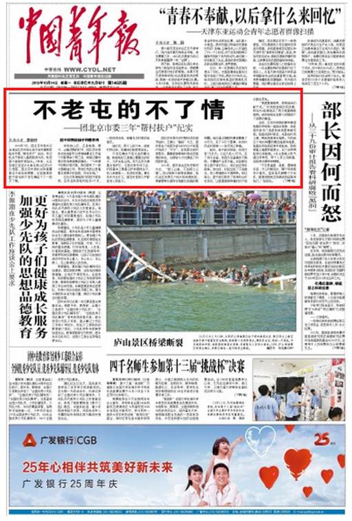 2010年7月,團北京市委書記會選定北京市密云縣不老屯鎮陳家峪村開展“幫村扶戶”活動,號召機關干部深入基層俯身為民,輪流派干部到村里駐點。3年來,從北京城區至密云水庫北岸山區的155公里路,團北京市委機關和直屬單位干部往來頻繁,這些城里的團干部也和不老屯鎮結下了一段不了情。