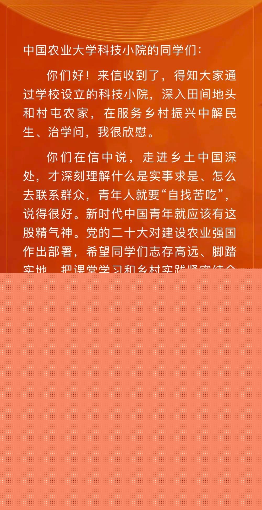 5月1日,中共中央總書記、國家主席、中央軍委主席習近平給中國農業大學科技小院學生回信,對他們深入田間地頭和村屯農家,在服務鄉村振興中解民生、治學問表示肯定,并寄語同學們志存高遠、腳踏實地,把課堂學習和鄉村實踐緊密結合起來,厚植愛農情懷,練就興農本領,在鄉村振興的大舞臺上建功立業,為加快推進農業農村現代化、全面建設社會主義現代化國家貢獻青春力量。