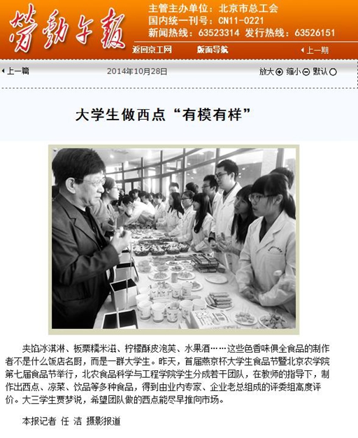 夾餡冰淇淋、板栗糯米滋、檸檬酥皮泡芙、水果酒……這些色香味俱全食品的制作者不是什么飯店名廚,而是一群大學生。昨天,首屆燕京杯大學生食品節暨北京農學院第七屆食品節舉行,北農食品科學與工程學院學生分成若干團隊,在教師的指導下,制作出西點、涼菜、飲品等多種食品,得到由業內專家、企業老總組成的評委組高度評價。大三學生賈夢說,希望團隊做的西點能盡早推向市場。