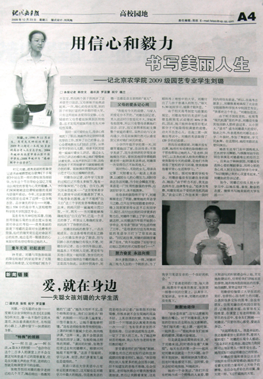 初見劉璐,清秀美麗的形象使記者不由地聯想起歌舞《千手觀音》中站在第一排的聾啞演員邰麗華,當年這個節目帶給全國億萬觀眾以視覺的享受與心靈的震撼,人們深深地被這位聾啞姑娘的美麗與堅強所感動。今年,北京農學院的校園迎來了這樣一位身殘志堅、品學兼優的同學——劉璐,她以538的高分考入我校植物科學技術學院園藝專業。