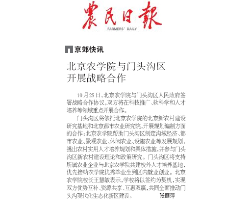10月25日,北京農學院與門頭溝區人民政府簽署戰略合作協議,雙方將在科技推廣、軟科學和人才培養等領域重點開展合作。