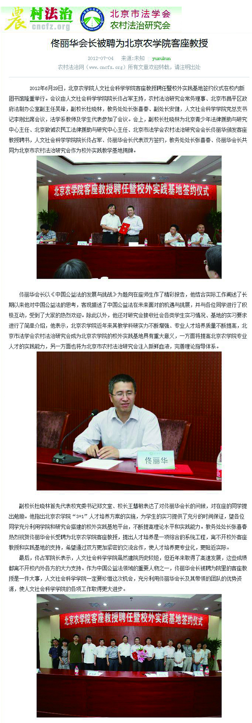 2012年6月29日,北京農學院人文社會科學學院客座教授聘任暨校外實踐基地簽約儀式在校內新圖書館隆重舉行。會議由人文社會科學學院院長佟占軍主持,農村法治研究會常務理事、北京市昌平區政府法制辦公室副主任吳鋒,副校長杜曉林,教務處處長張喜春、副處長安健,人文社會科學學院黨總支書記李剛出席會議,法學系教師及學生代表參加了會議。會上,副校長杜曉林為北京青少年法律援助與研究中心主任、北京致誠農民工法律援助與研究中心主任、北京市法學會農村法治研究會會長佟麗華頒發客座教授聘書,人文社會科學學院院長佟占軍、佟麗華會長代表雙方簽約,教務處處長張喜春、佟麗華會長共同為北京市農村法治研究會作為校外實踐教學基地揭牌。